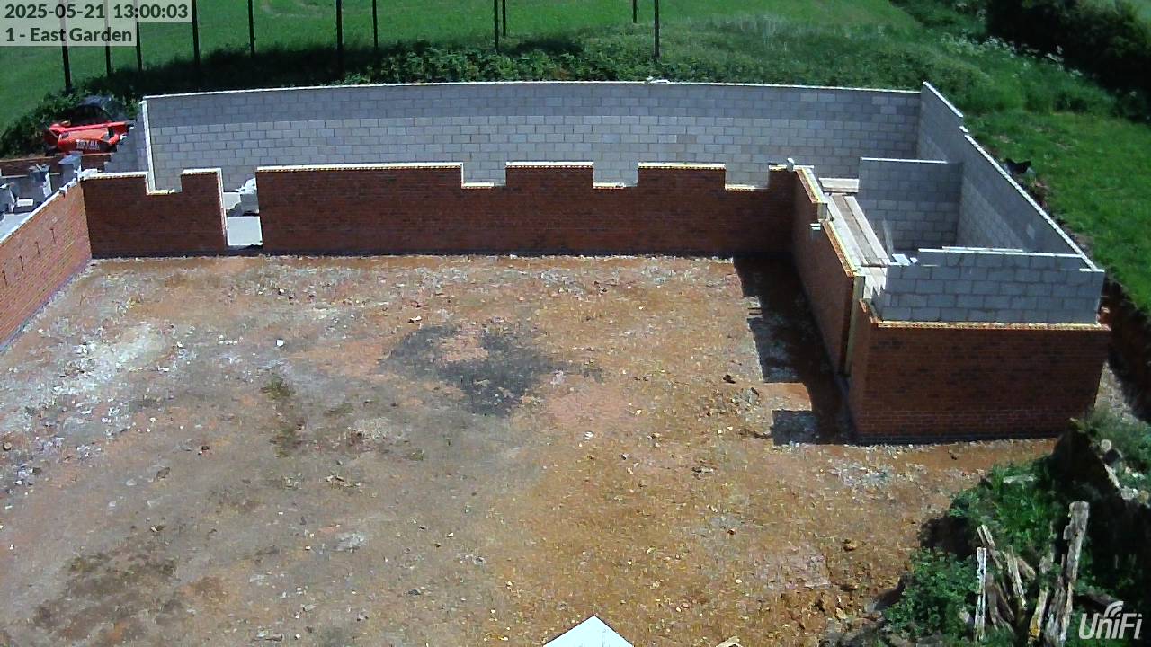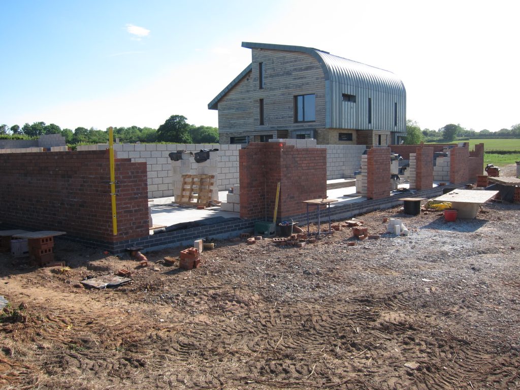 Good progress on framing the floor joists between the ‘attic’ trusses installed yesterday – and also in forming 3 of the 4 shallow brick arches over the garage door openings. There are 8 or 9 courses of bricks and blocks to go on top of the arches – although the weight of the roof will be supported by steel beams sitting about half a metre behind the brickwork (supported by the blockwork piers visible through the door openings).