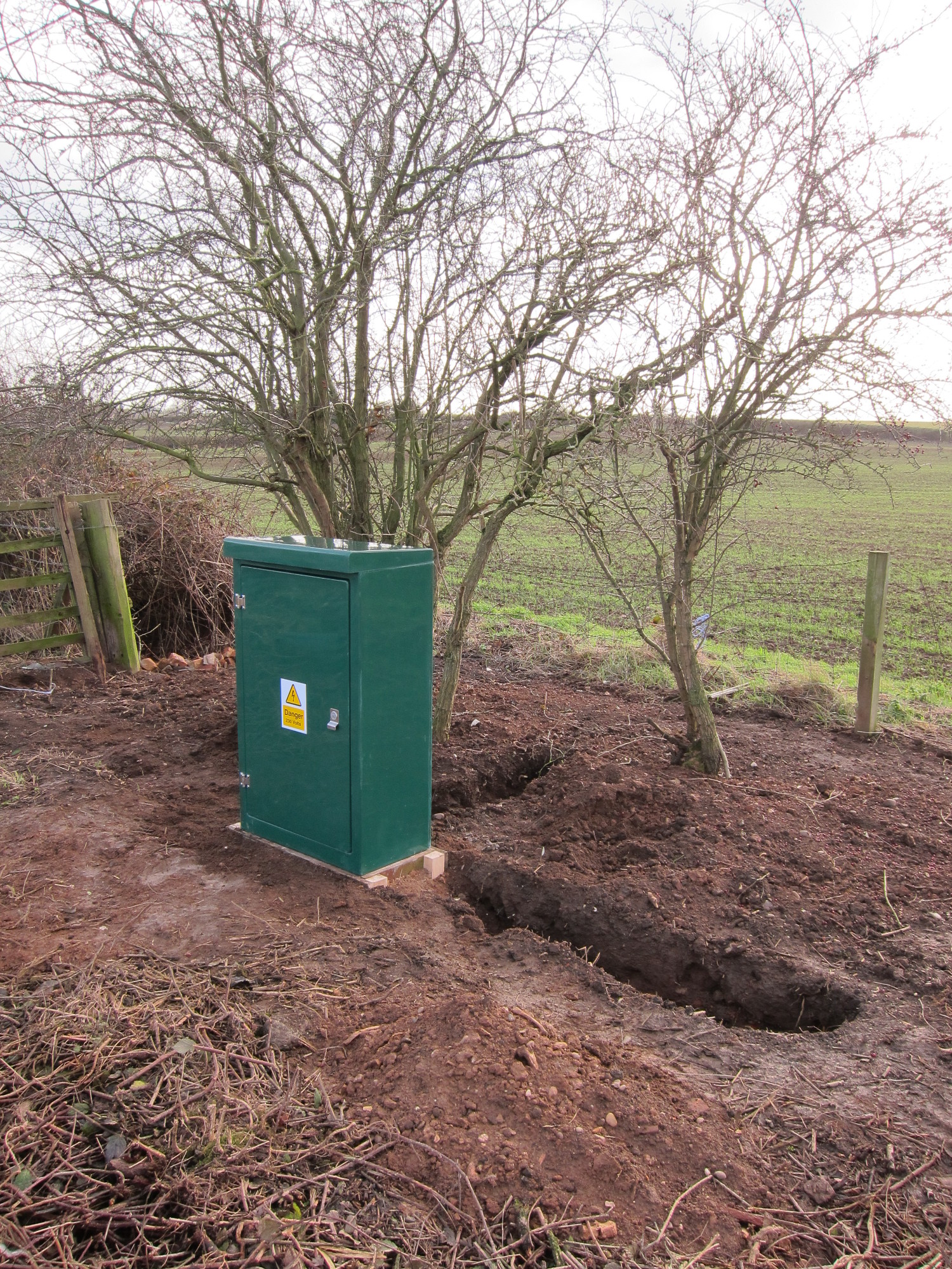 The supply cable runs down the new pole and underground for about 3 metres before entering the bottom of the cabinet, so it all looks rather neat. Once I’d cleared all the brambles away there wasn’t much of the old hawthorn hedge left (and I had to coppice one of the remaining hawthorns to provide access) but once the hedge gets replanted it will start to look a bit more natural again.