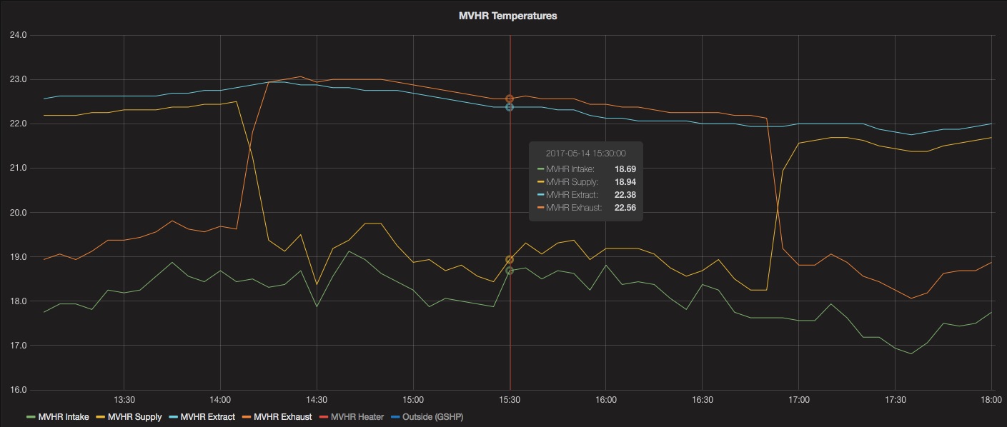 Slightly annoyingly, there seems to be no way to access the data being collected by the PAUL MVHR unit controller so this data is monitored via a separate set of sensors – see here for more details. The image above is a screen-shot from Grafana displaying data stored in an InfluxDB database.
