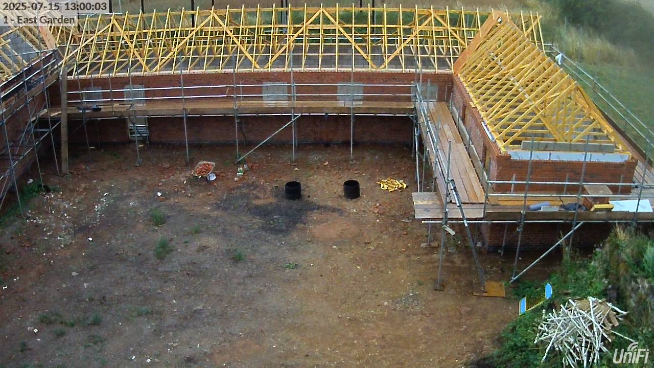 The forecast wet and windy weather arrived. The build team made some progress in the morning (adding the double row of bricks to the north-west gable wall) but headed home before lunchtime. Since the weather has generally been good – and is forecast to be dry for the coming days – there’s little reason to take the risk of working in the rain, when scaffold boards are slippery and it’s harder to achieve a good finish on the mortar.