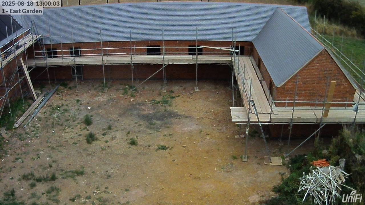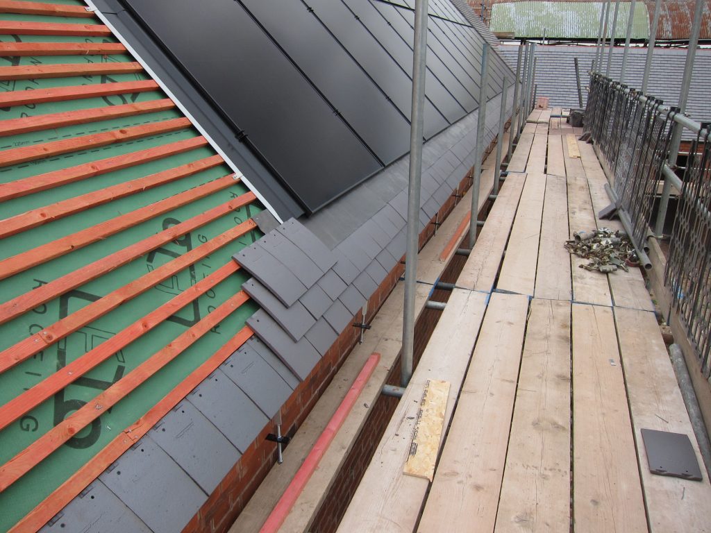 Some cooler and more overcast weather this week, making for rather better working conditions on site. Progress on the mortar fill on the gable-end verges on the North end of the Garage block – and on the detailed work fitting the tiles at the Northern end and along the bottom of the solar panel array.