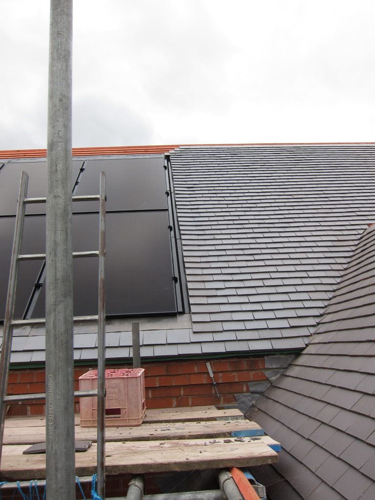 The solar panel team also returned to site, to advise on the tile fitment above the panels and to first-fix install the 25m of cabling between the solar panels and the inverter. (This cabling carries DC at roughly 600V so it’s no issue having a relatively long cable run.)