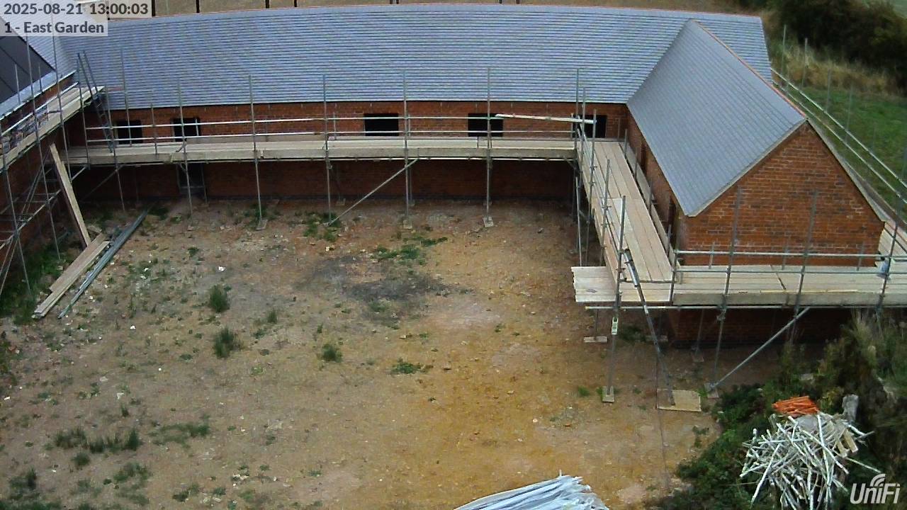 More progress with the first-fix (and second-fix) electrical installation and more roof tiling on the one remaining section – the North-facing roof over the Garage. That’s now used up the last of the tiles on-site and the remaining few thousand aren’t due until early next week. There are 100 ridge tiles on-site (more will be required to finish the job) but those are waiting for the new Dry-Ridge Fitting Kits, due in the same delivery. There’s also Guttering on-site – but not yet any Gutter brackets… – so building work (apart from the electrics) will resume after the Bank Holiday weekend.