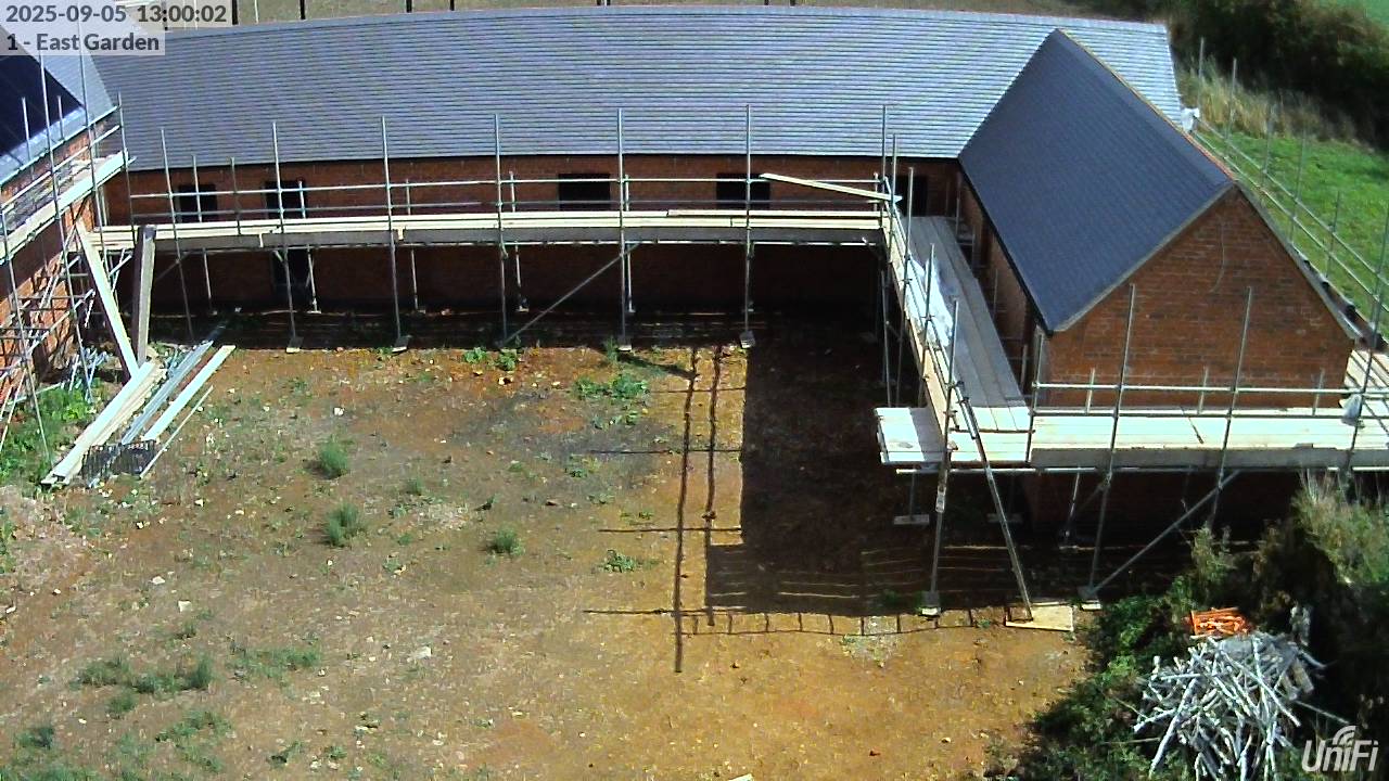 Better weather today, enabling the installation of the guttering to be completed. With the scaffolding still in place, the installation of the aluminium downpipes has been postponed – so there are temporary polythene sleeves acting as downpipes for now. The scaffolding around the inside of the Courtyard is due for removal on Monday (leaving the scaffolding around the back of the buildings in place to enable the ridge tiles to be installed – once the fixing and ventilation solution for those has been confirmed).