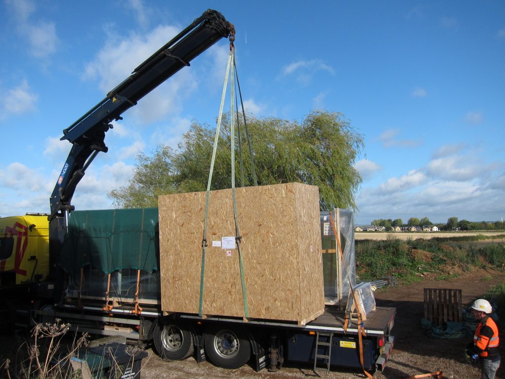 Quite a busy day, with deliveries of 15 of the lighting fixtures and – notably – of the main set of doors and windows. These were custom made in Latvia (by Arbo Windows) and arrived in one large crate, weighing more than 700kg.