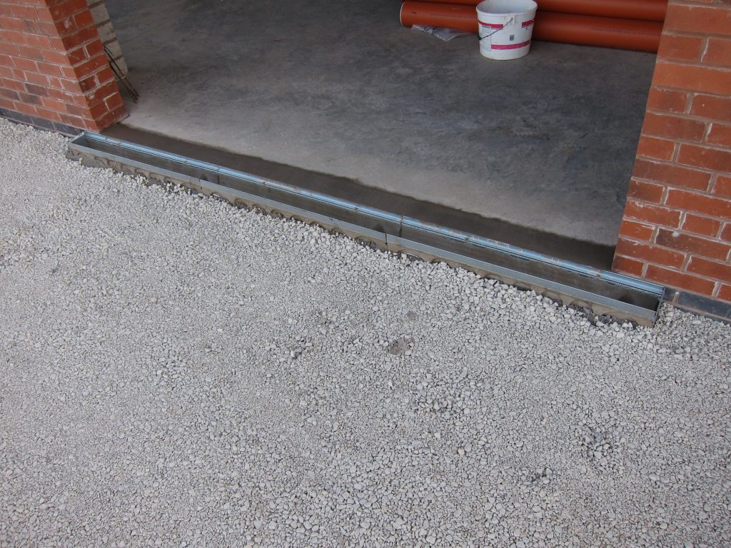 Filling the gap between the Garage floor slab and the four threshold drains with concrete (which should dry to better-match the colour of the floor slab). As previously noted, the Garage Doors (roller shutters) will sit behind the brickwork openings.