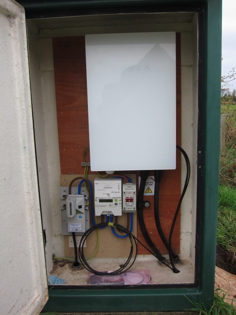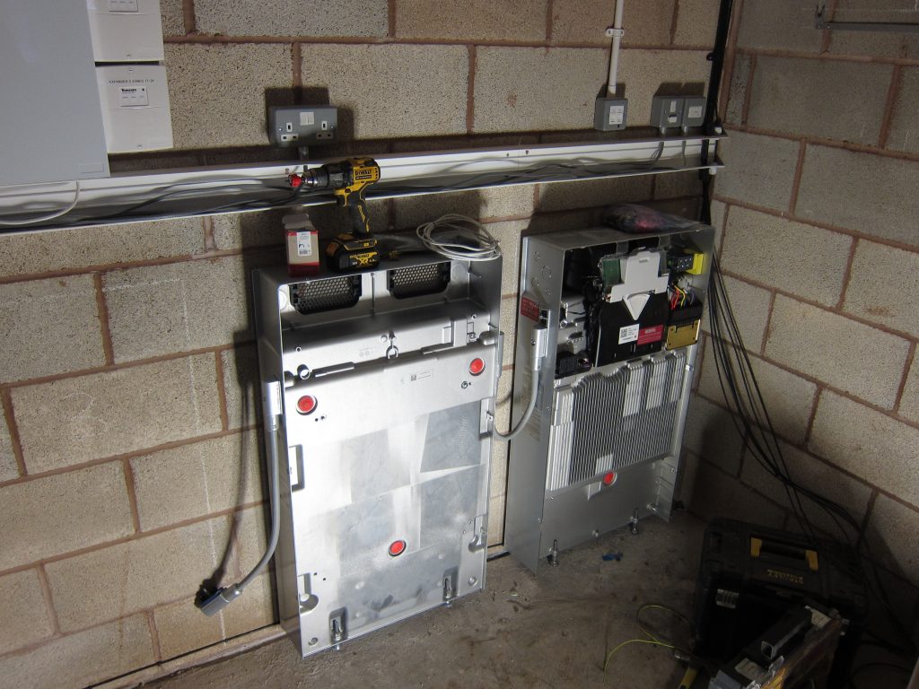 The main PowerWall 3 unit, which is a combined inverter and battery storage unit, was always destined for installation in the Plant Room, which is (intentionally) the nearest part of the building to the GRP cabinet. In order to add further storage capacity there will be two battery expansion packs – although only one was installed today, due to space and weight limitations on the installers’ van.
