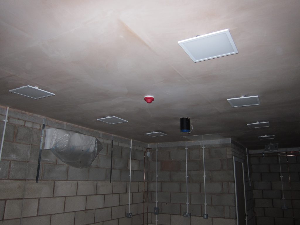 Good progress on the electrics today though. The socket ring-mains are now ‘live’ in the Utility Room and Workshop, and more than half of the ceiling-mounted light fittings are installed and tested. Mains power is also available for the heat pump, water heaters, and alarm system.