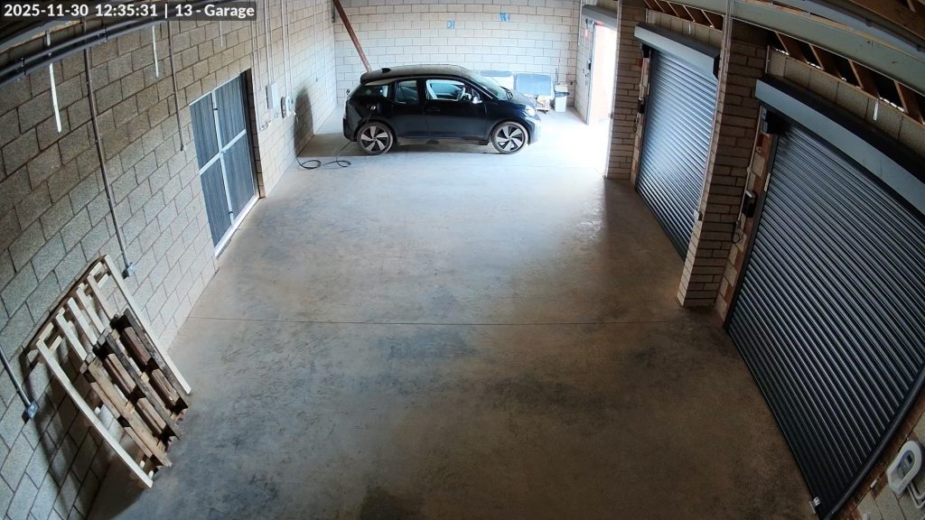 The BMW i3 looks a bit lost when viewed from the CCTV camera that monitors the garage. The plan was always to park that car there, which influenced the location of the ‘primary’ Zappi EV charge point at the back of the Garage, between the first and second parking bays. (The ‘secondary’ Zappi is just visible at the bottom-right of the photo, where it can be used from the third parking bay and for cars parked outside.)
