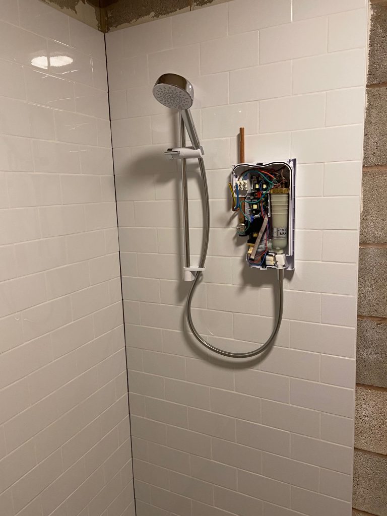 Having completed the modest area of wall tiling (two 2m2 sections) for the shower the other day, I was able to fit the instantaneous electric shower unit to the tiled wall so the plumber can connect its mains water feed at their next visit.