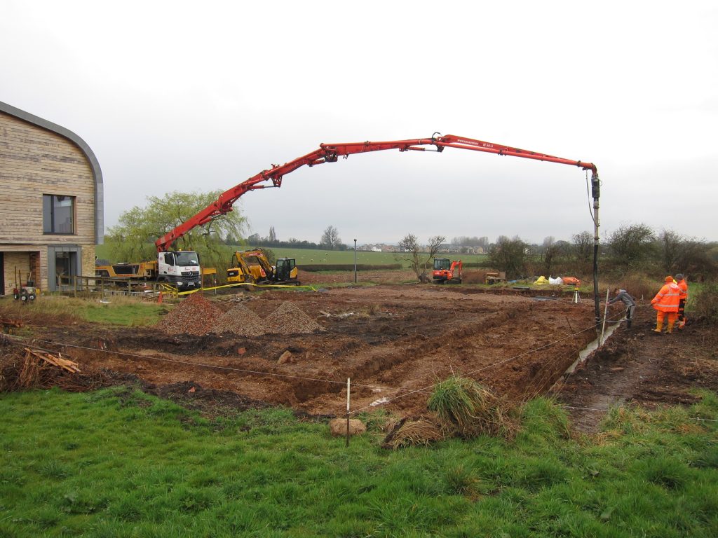 A successful day pouring the concrete to fill the foundation trenches – despite it being the first day with significant rain since work started. A Putzmeister 38-5 concrete pump with a 32 metre boom did a good job of reaching the far side of the site and the concrete plant and delivery drivers did a decent job of getting 9 lorry-loads to site reasonably well spaced-out between 08:30 and 14:00.