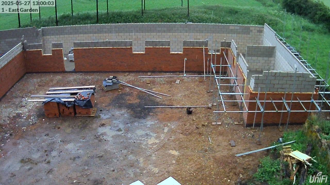 The first properly wet day since work started – which isn’t bad for 12 weeks. The rain proved problematic for using a new (so very wet) batch of ready-mixed mortar, so work stopped early.
