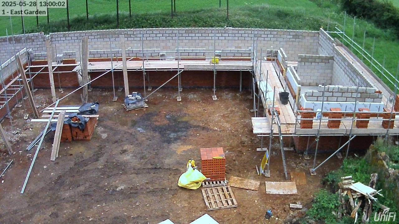 Much less rainy today so decent progress erecting more of the scaffolding, and more insulation and blockwork on the right, where the scaffolding had been completed.