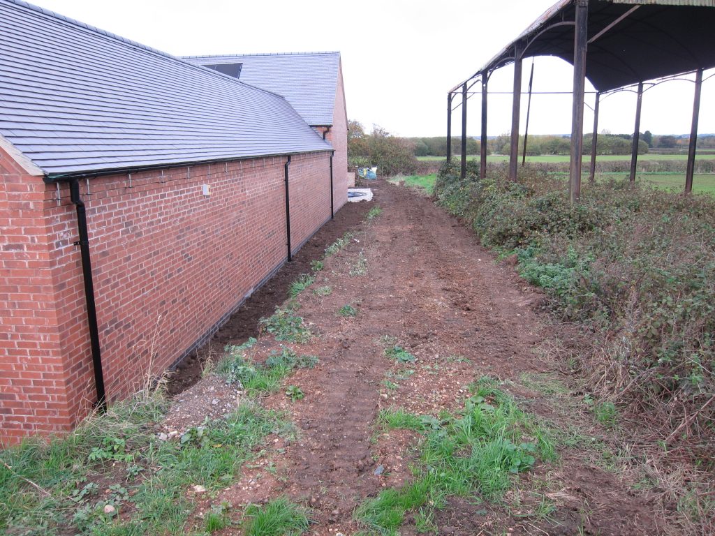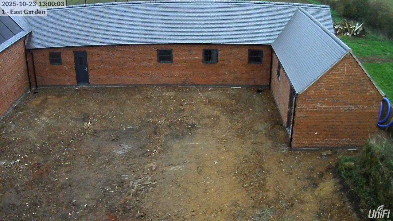 There was wet and windy weather overnight and for the first part of the morning, which held up progress on the ground works – but has mostly filled the rainwater tank. The team are waiting for delivery of some additional components for the inlets and outlets for the rainwater attenuation pond, which had been promised for delivery yesterday or today but are now (allegedly) due next week. Instead of installing those they completed the tidy-up of the ground to the East side of the building.