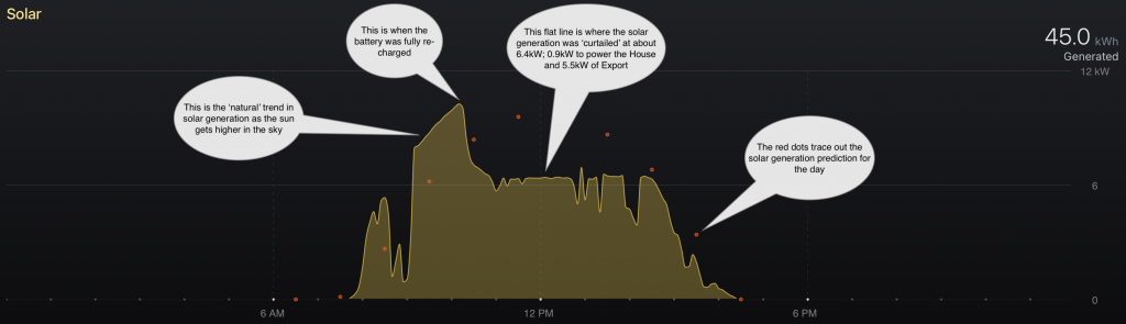 The solar generation would probably have peaked at around 12kW and I estimate there were 5 more hours when it exceeded 6.4kW. As it turns out, there was no need to charge the batteries from the Grid the previous night – so the money used to do that could have been saved.
