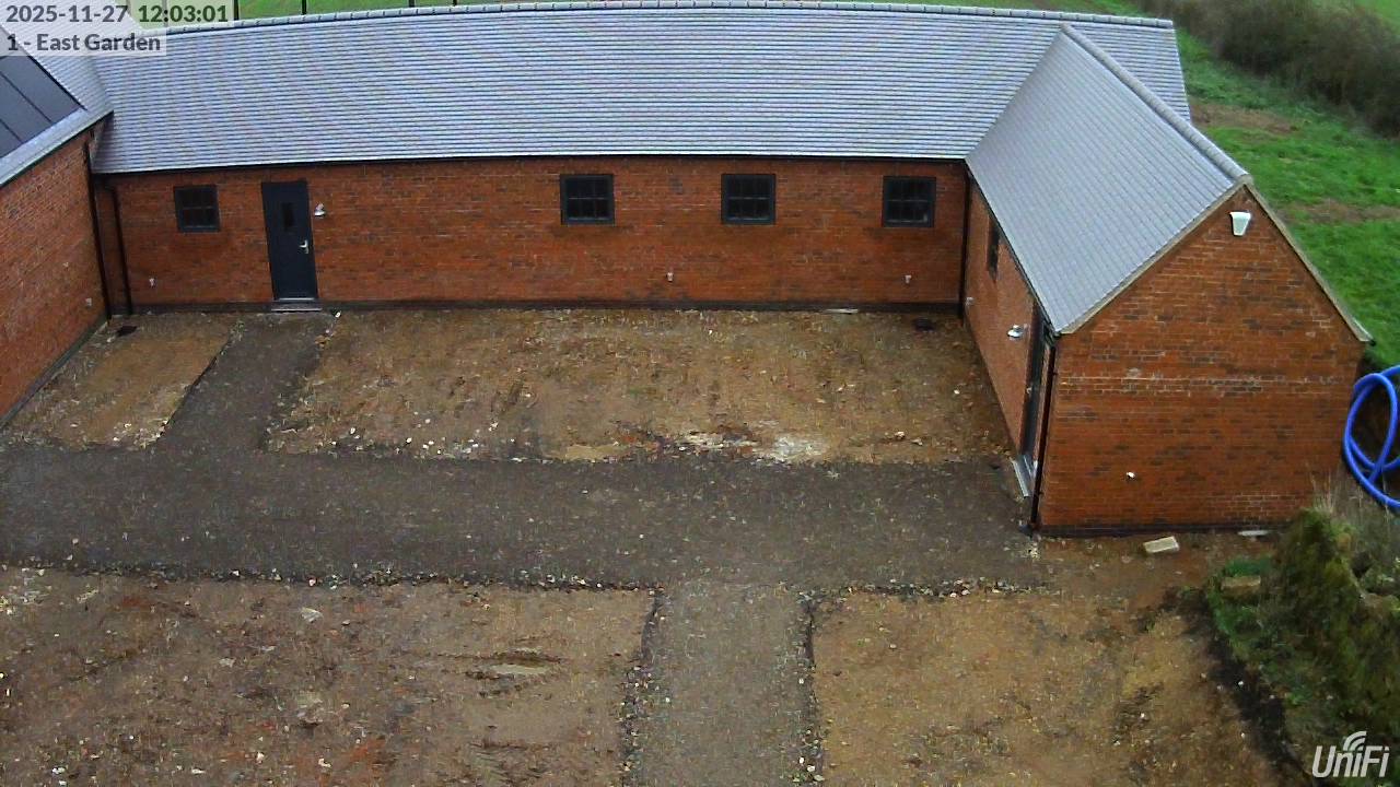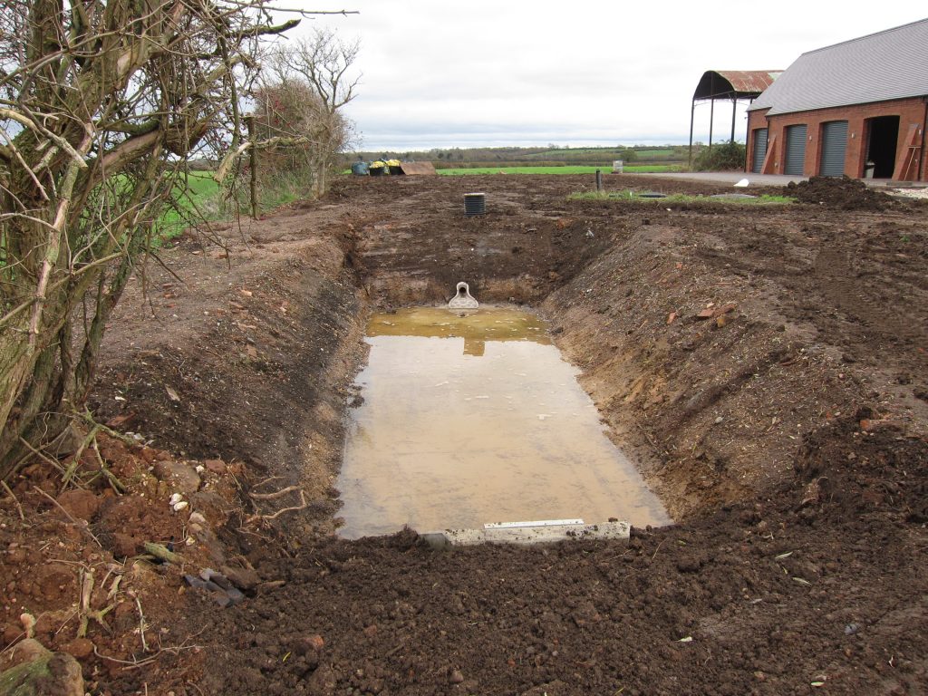 The main build team are firmly in ‘finishing up’ mode, having completed the drainage works yesterday. The rainwater attenuation pond is now completed and the area to the East of that has been re-levelled and profiled into the GrassGuard blocks bounding the block-paved parking area.