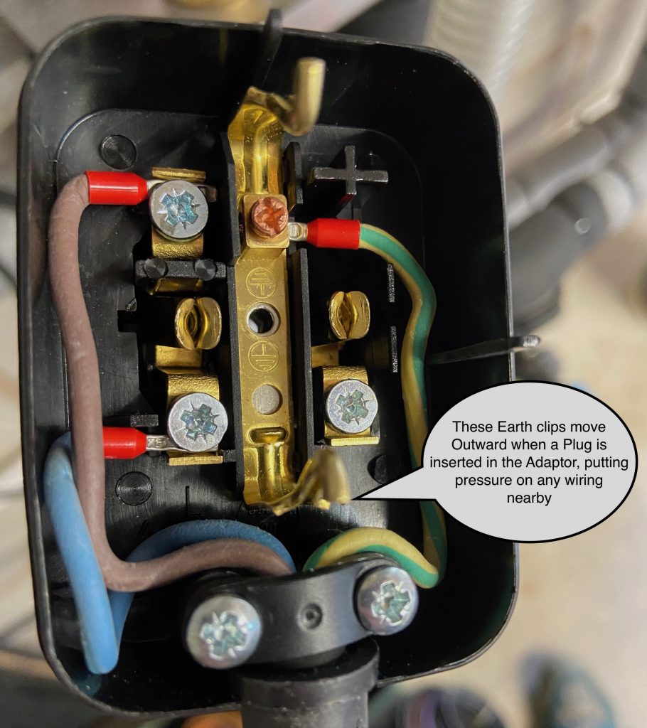 The underlying issue turned out to be that the Adaptor has two sprung ‘clips’ which provide the Earth contact on the top and bottom of the inserted Plug. These clips move ‘outwards’ when the Plug is inserted and the lower one was very close to the wiring entering the Adaptor at the bottom. Evidently this clip placing pressure on a wire was enough (over time) to compromise the insulation and cause a short circuit. (It was the Blue wire which had failed. Normally that would be Neutral but here it’s acting as Switched Live.) The resolution was to leave none of the outer cable sheathing projecting beyond the cord grip, allowing the wires to be routed further away from the Earth clips, after the damaged wiring was cut off and re-terminated.