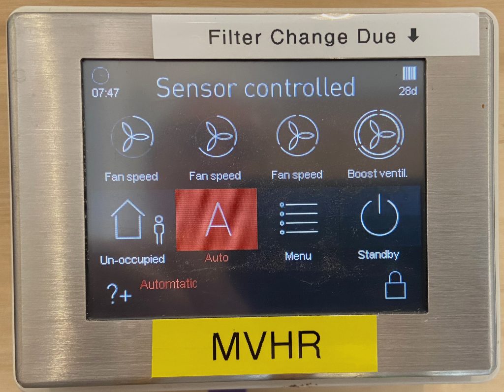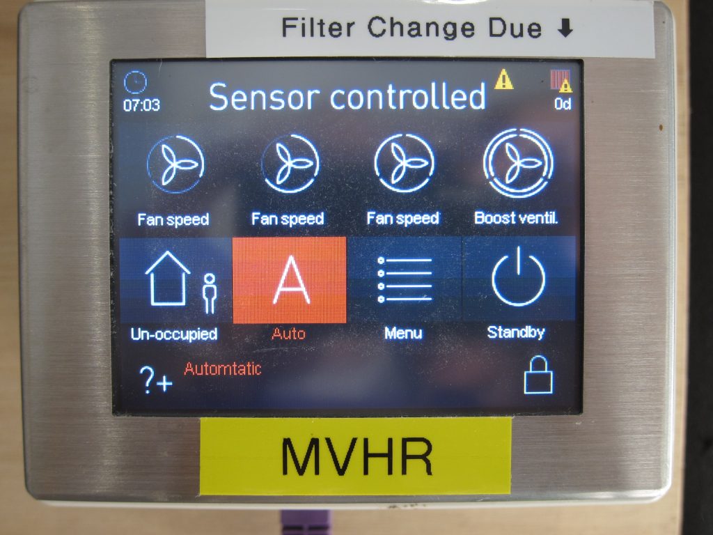 The MVHR unit for the House is a PAUL Novus 450 installed in the Plant Room. It is managed using the touch-screen controller mounted in the cupboard in the Utility Room (where any warning messages are slightly more likely to be noticed).