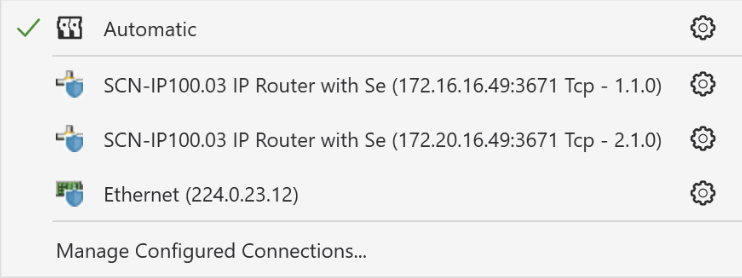 ETS ‘KNX Bus’ menu when IP Routing connections are working correctly – both IP Router devices are auto-detected