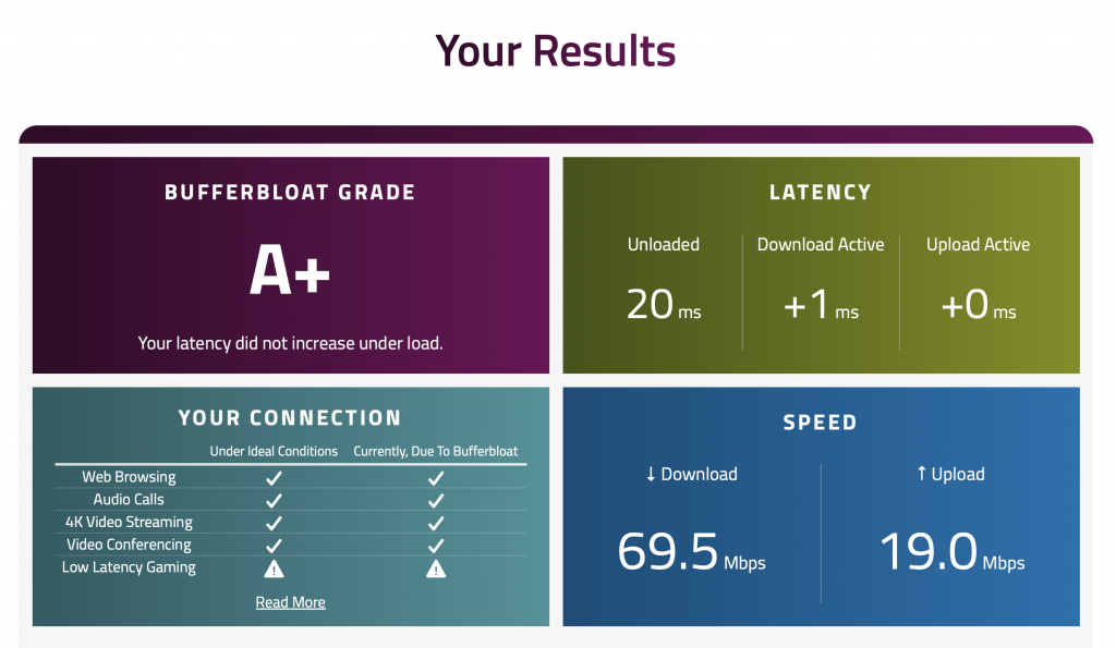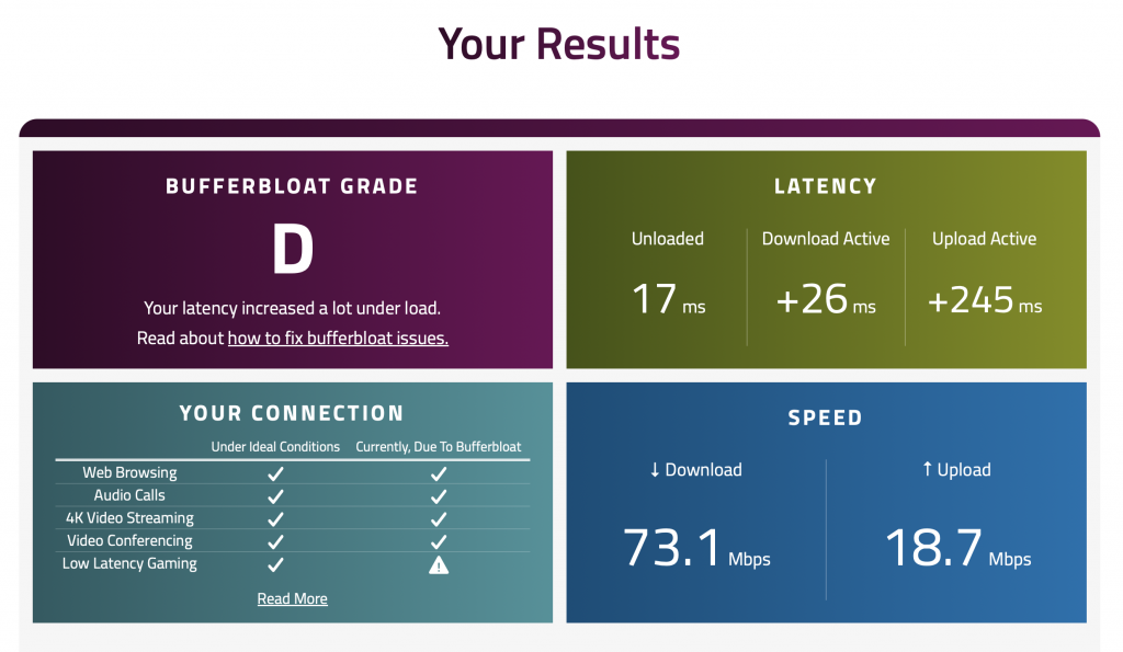 y which includes an assessment of BufferBloat via its ‘Responsiveness’ metric. (A Low score for Responsiveness is ‘bad’.)